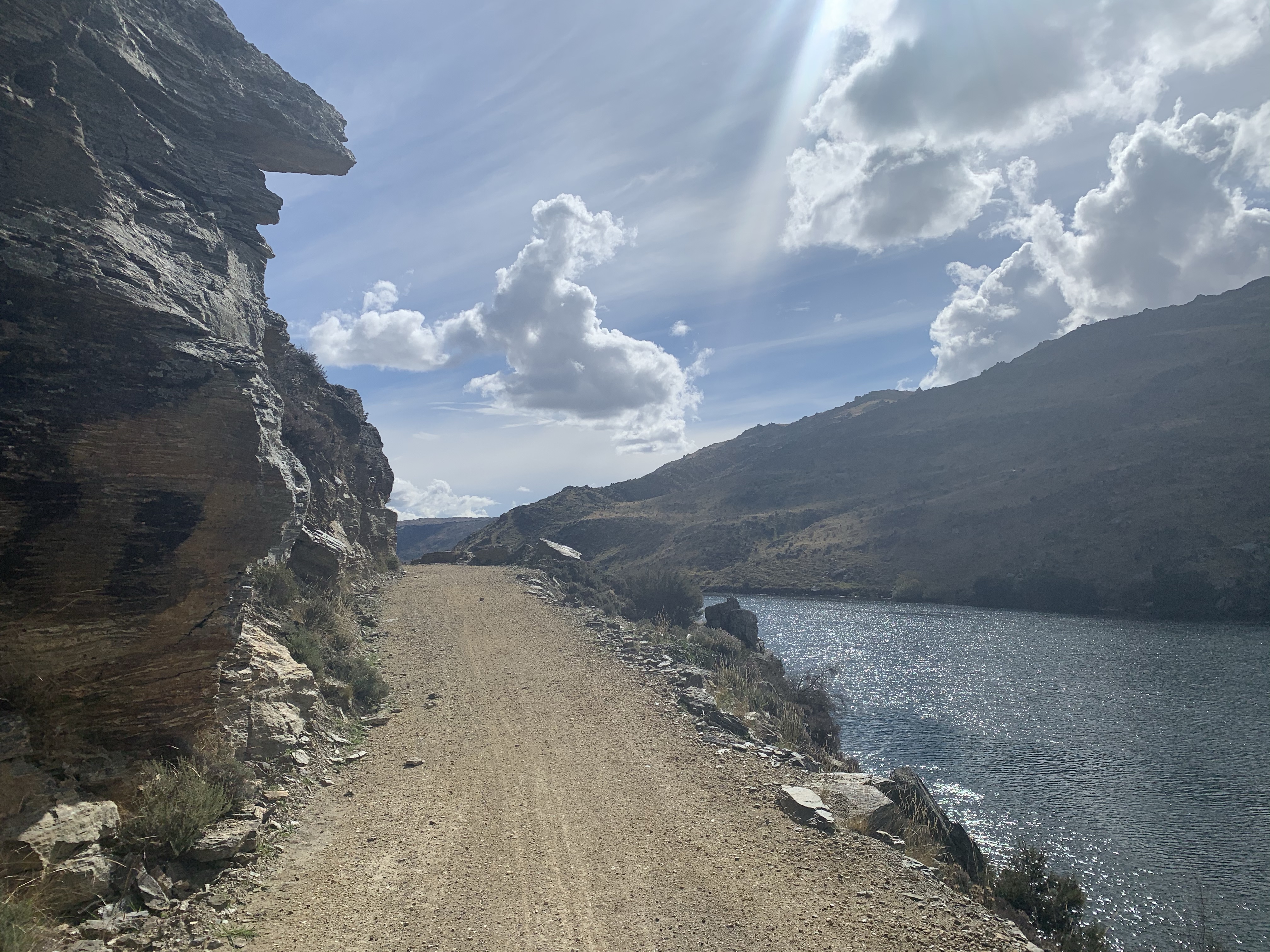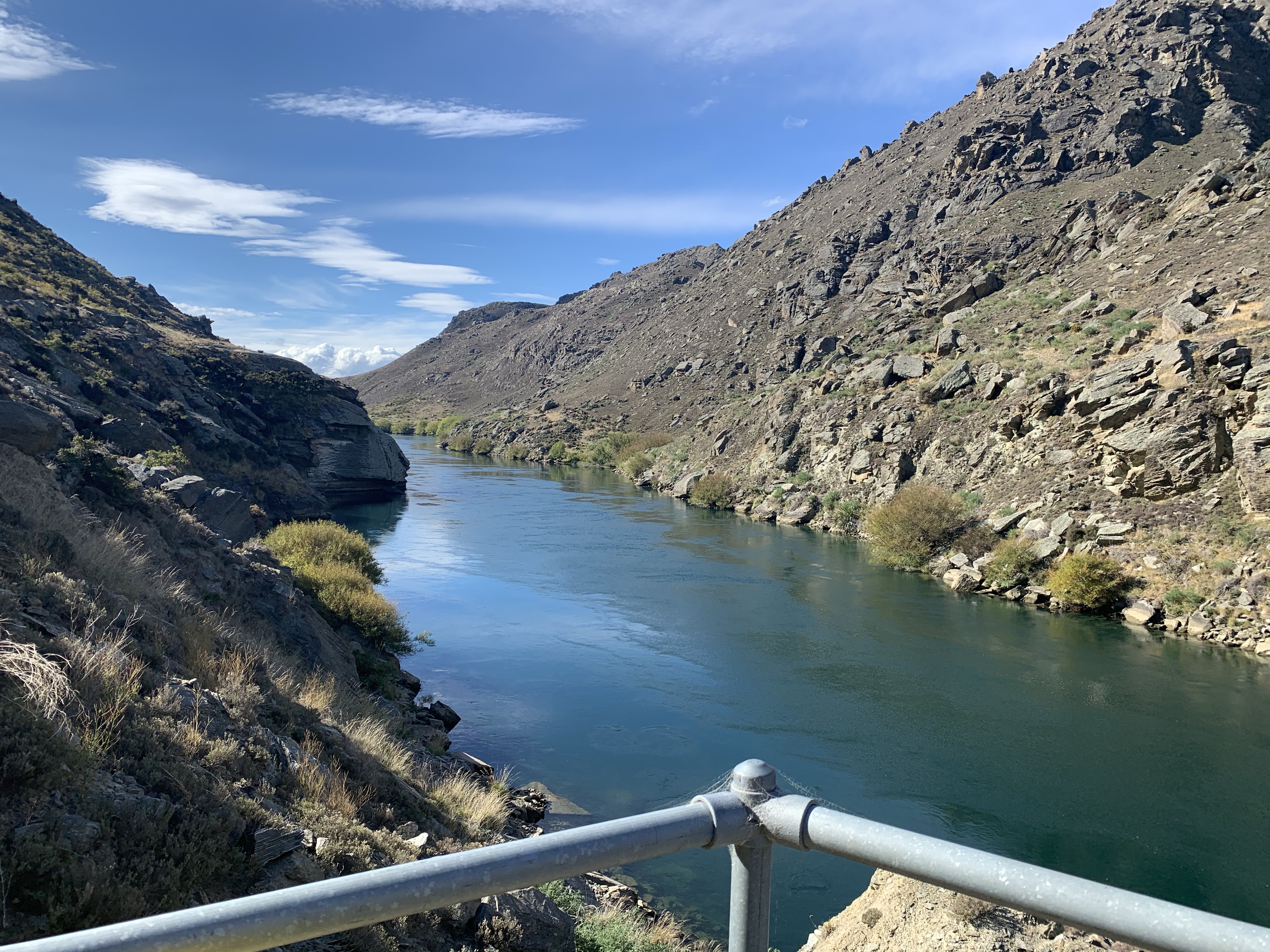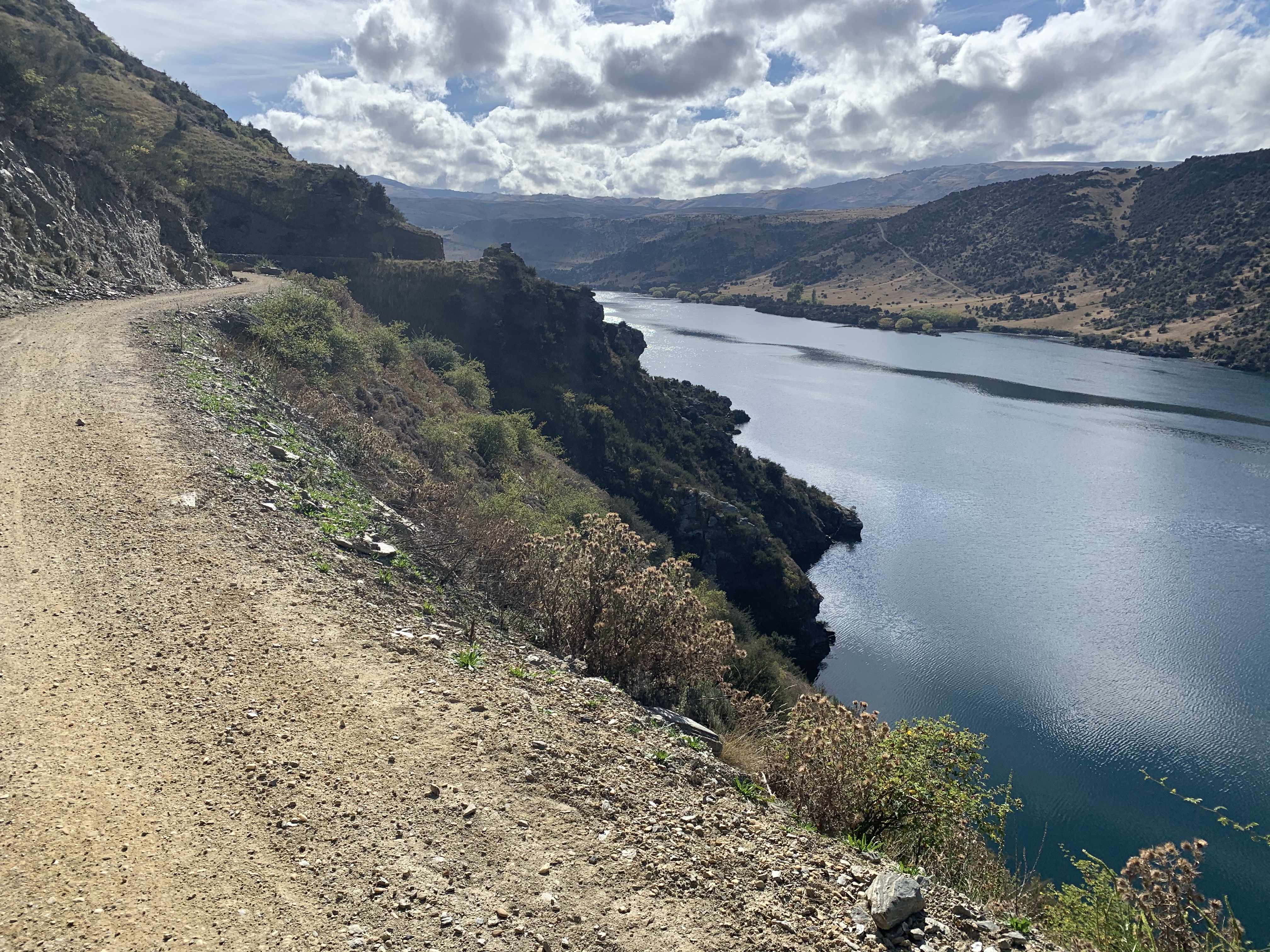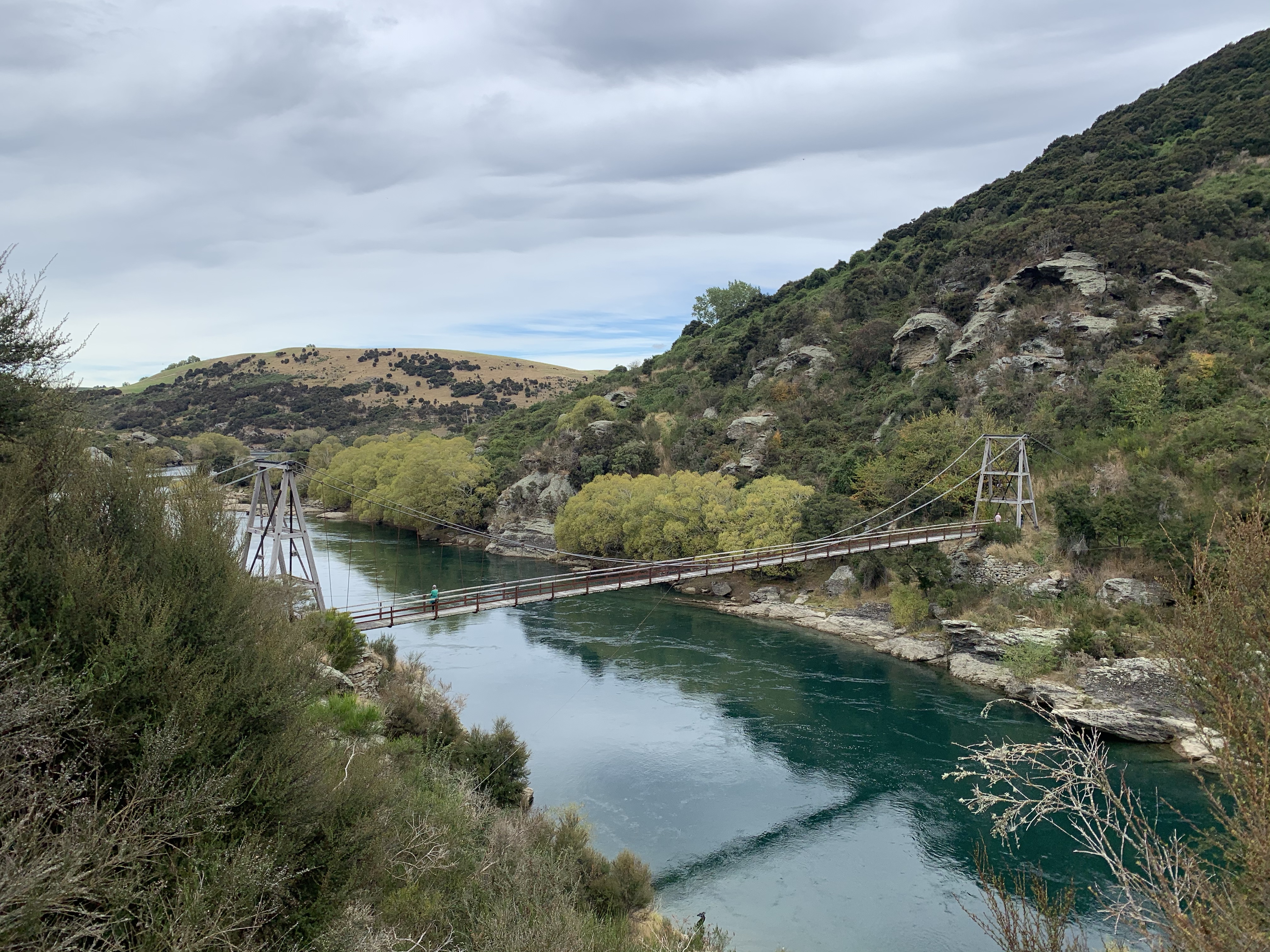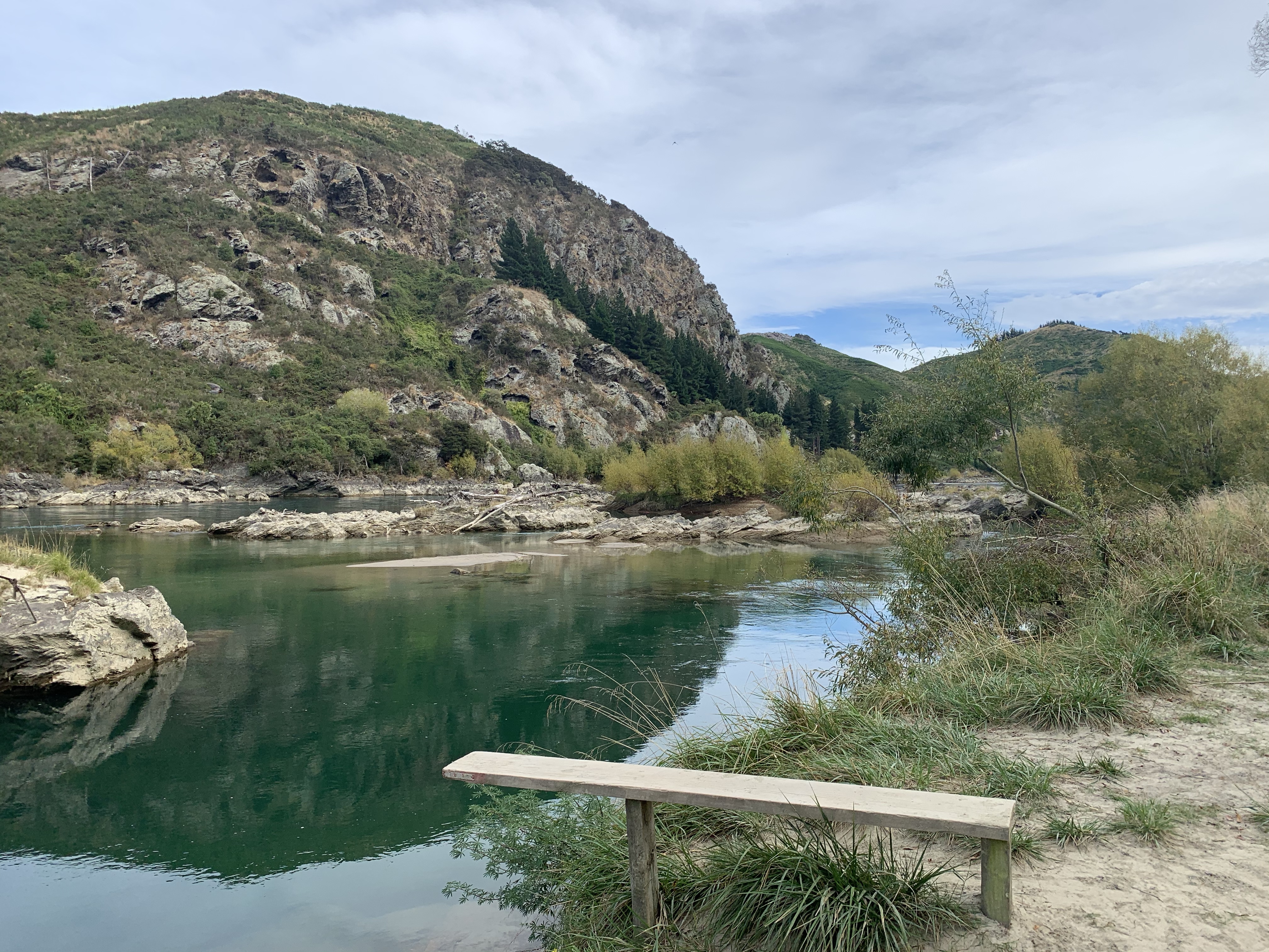The trail continues alongside the Clutha Mata-Au River on high narrow tracks and stunning views reminiscent for me of Doubtful Sound – the bush covered hills straight down to waters edge. Rocks on the hills opposite side, were a great contrast of views. And the tranquility, not a sound in sight