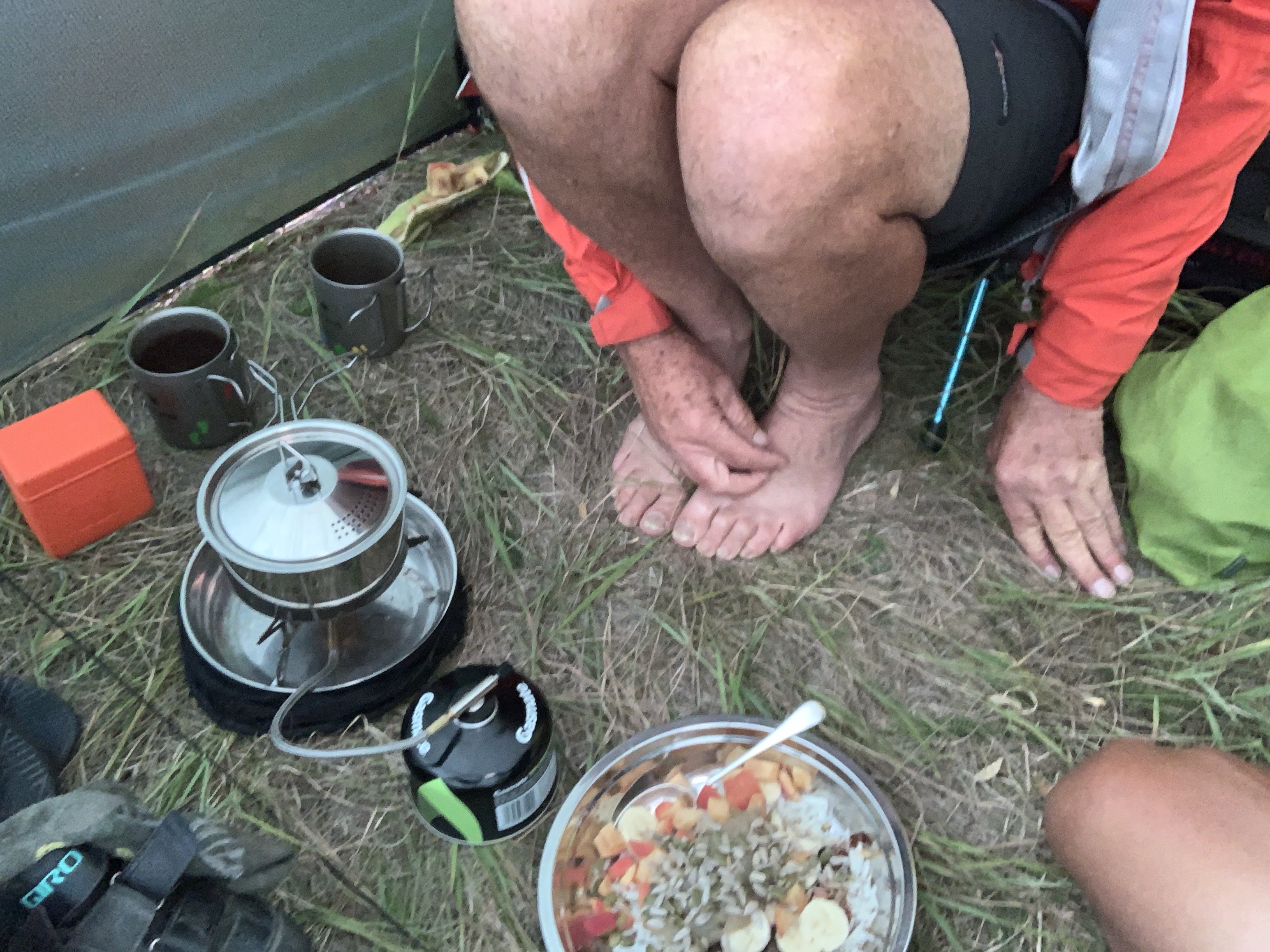 The rain that arrived overnight was due to clear mid morning, so we rolled back the footprint, put any unnecessary panniers outside in the rain and enjoyed our breakfast under cover in the vestibule.