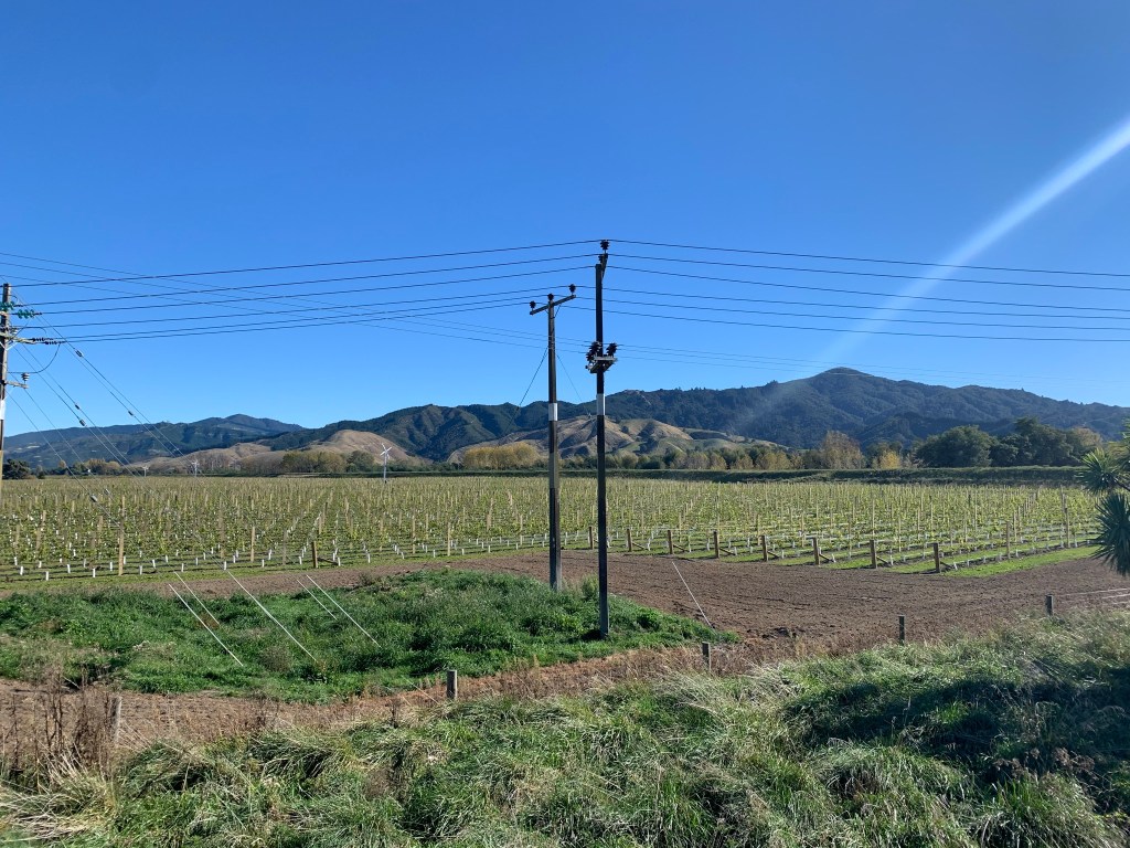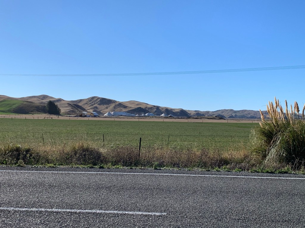 We had a comfortable ride to Ward. A quick stop for a cuppa and treat, and posting our Mother’s Day cards, and onward to end our day in Seddon, riding past Lake Grassmere, where our salt is produced and then our first of many vineyards to come.