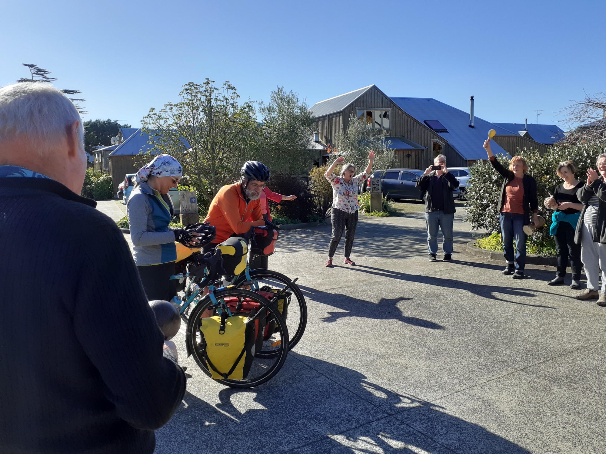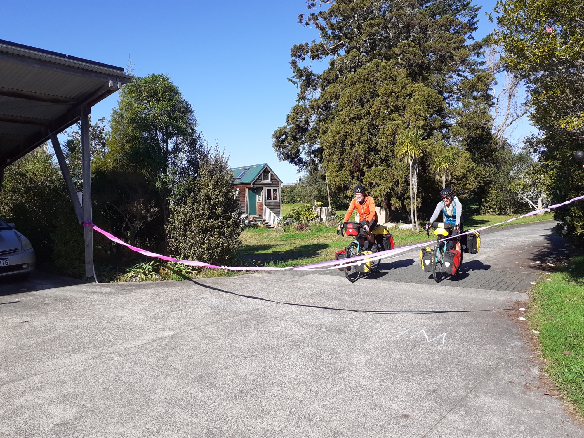With a bit of timely communication, and a couple of minutes wait up the road, we arrived on time to a wonderfully warm welcome home, complete with a finishing line and plenty of noise-makers!