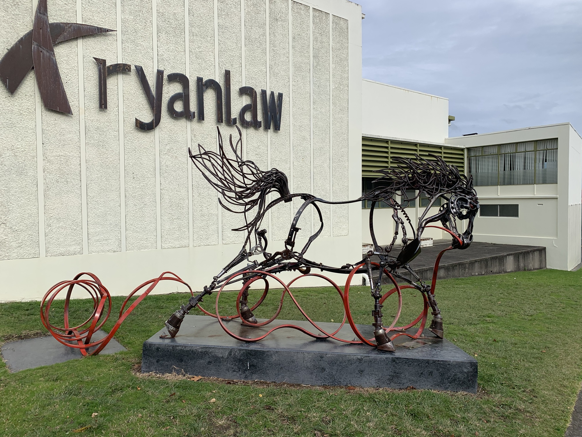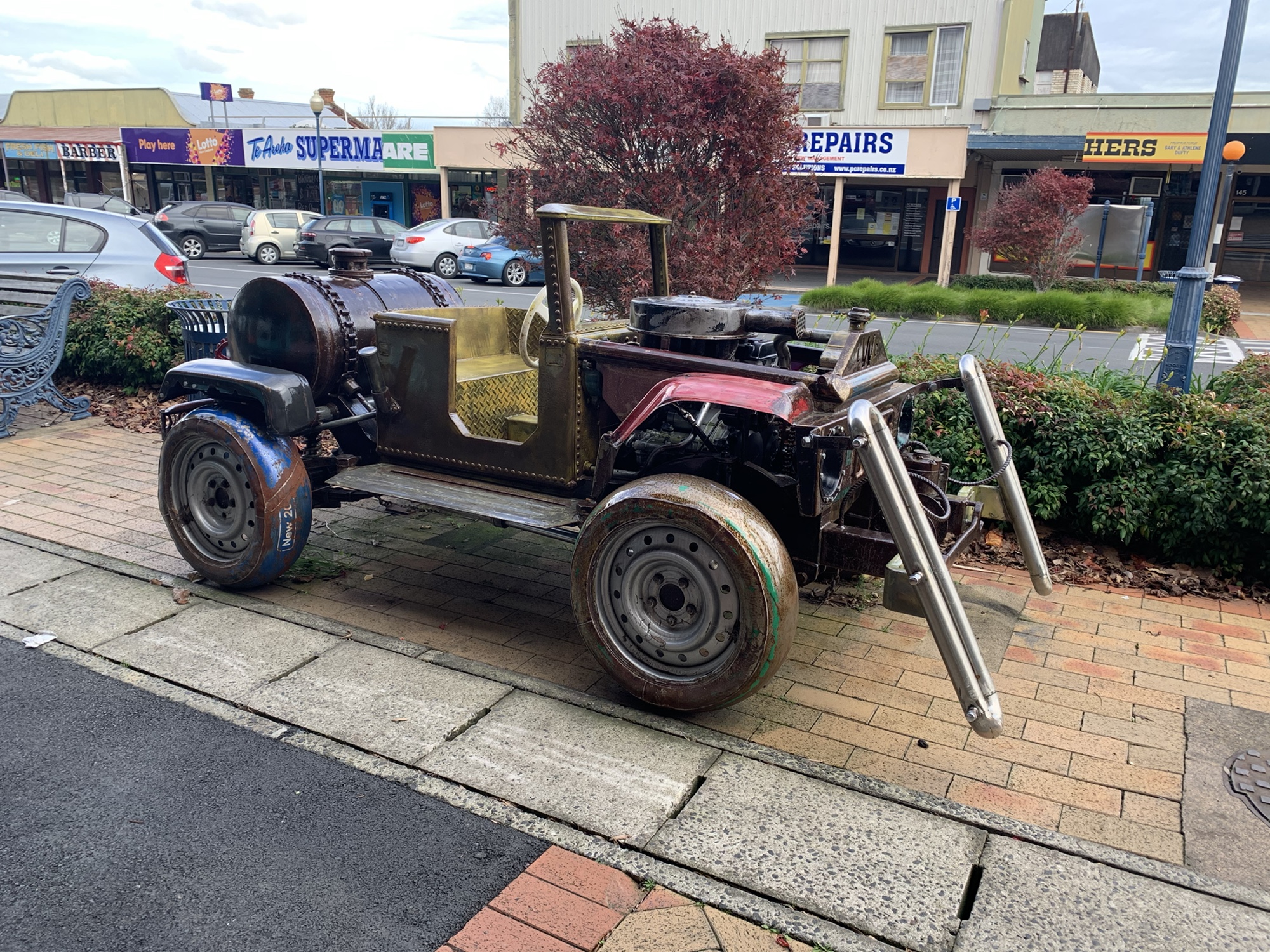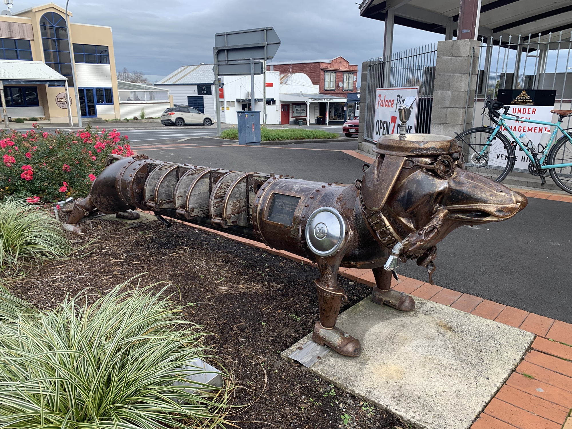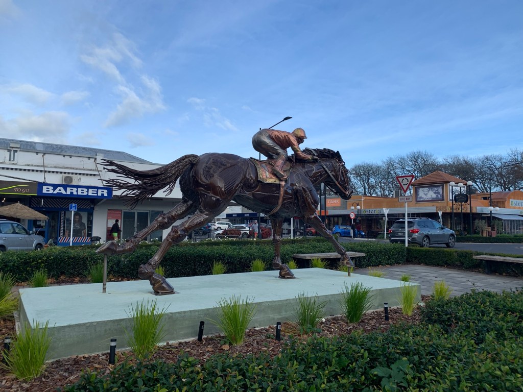 Today we started the Hauraki Rail Trail, which we take us through to Kaiaua and so nearly home. Riding back through Matamata’s main street, we stopped to admire the artwork of the racehorse. Created by sculptor Adrian Worsley from scrap metal and old tools and farm implements, it is beautiful!