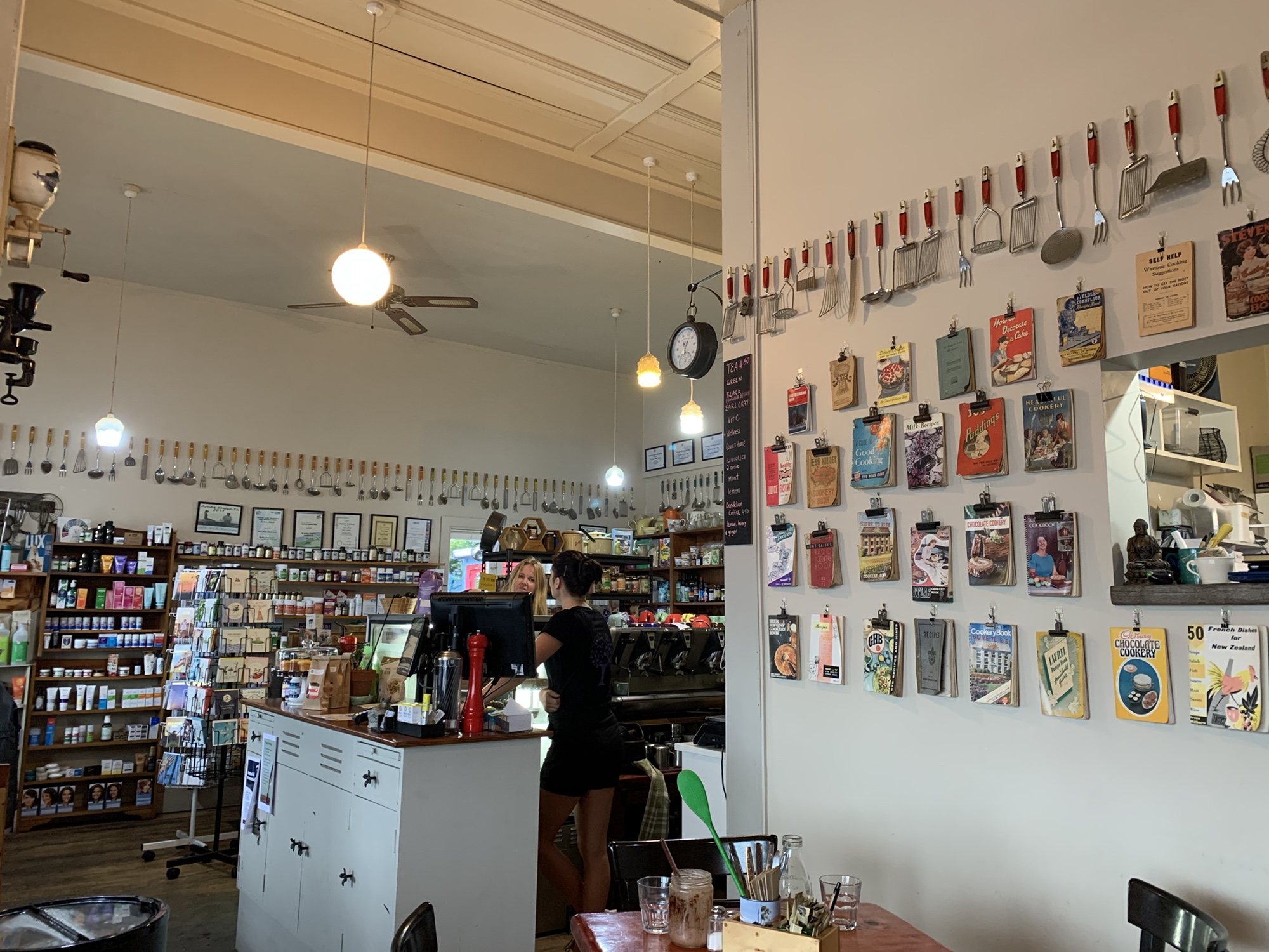 The English Skyline kitchen implements around the walls were a collection years in the making. The different handle colours representing different eras of production. The wall of hanging cookery books bought back childhood memories of some of the books in my Mum’s kitchen. And full of organic treats and supplies. Just heaven!