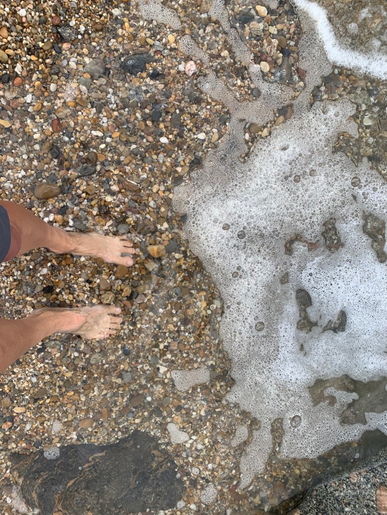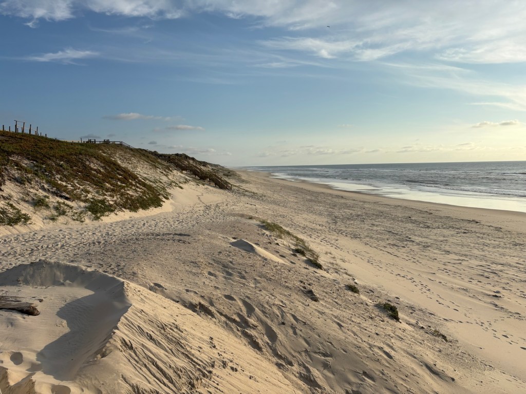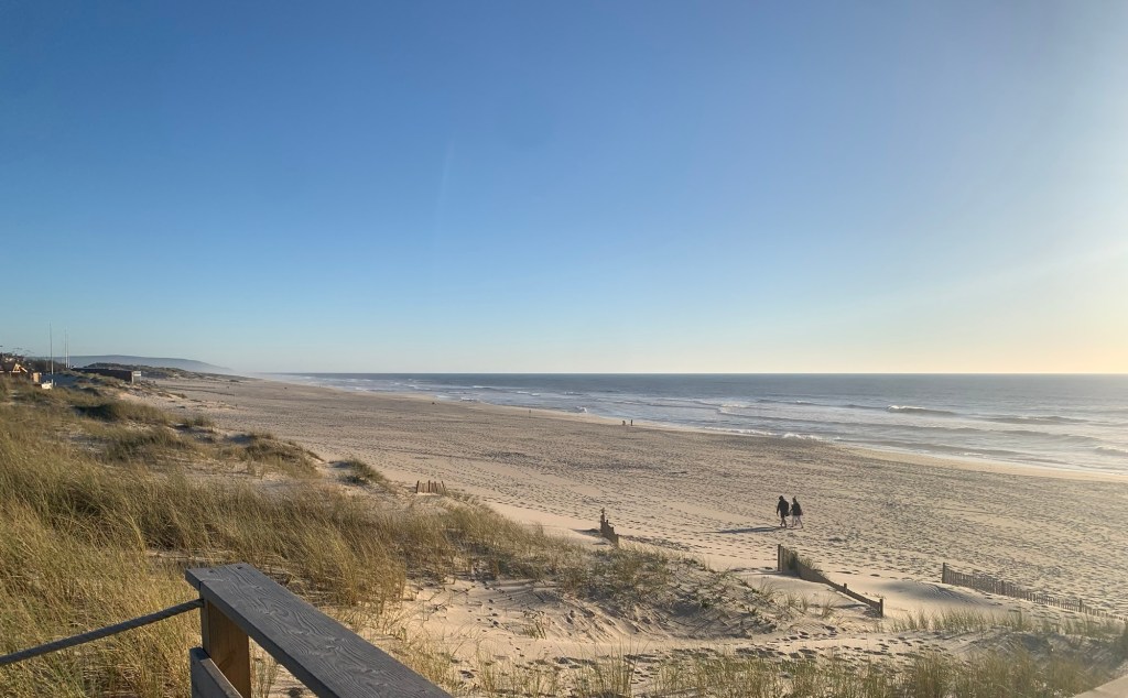 With the tent setup in the Praia (beach) de Vieira campground, we walked down to the beach. Long stretches of fine white sand with mostly closed tavernas and apartments. Guessing it’s a bit early in the season to have many people around.