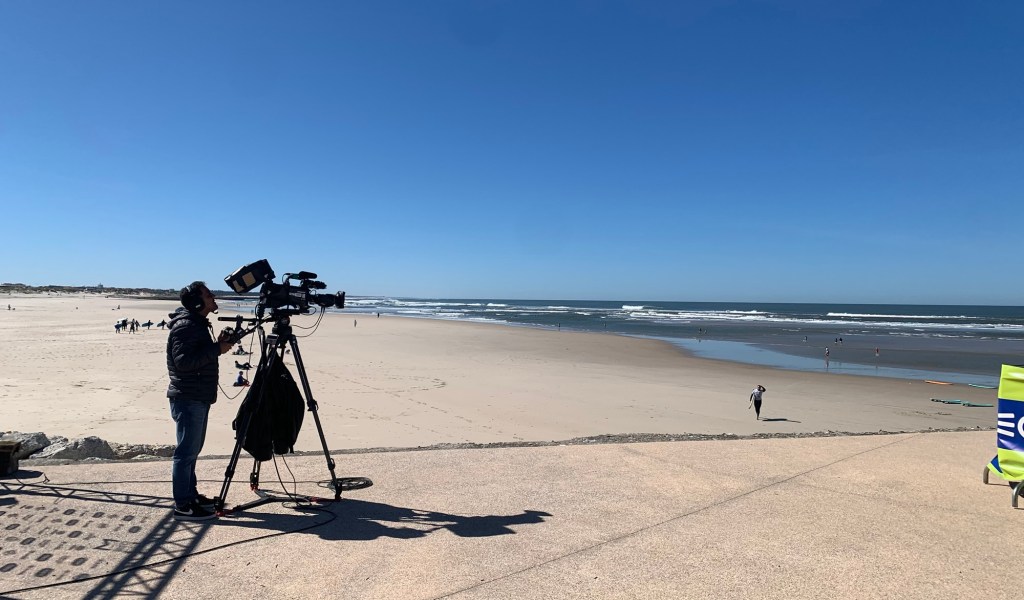 It was a cold but clear morning as we continued northbound, riding to the ferry at Praia de Cabedelo where the last day of a surfing competition was under way.