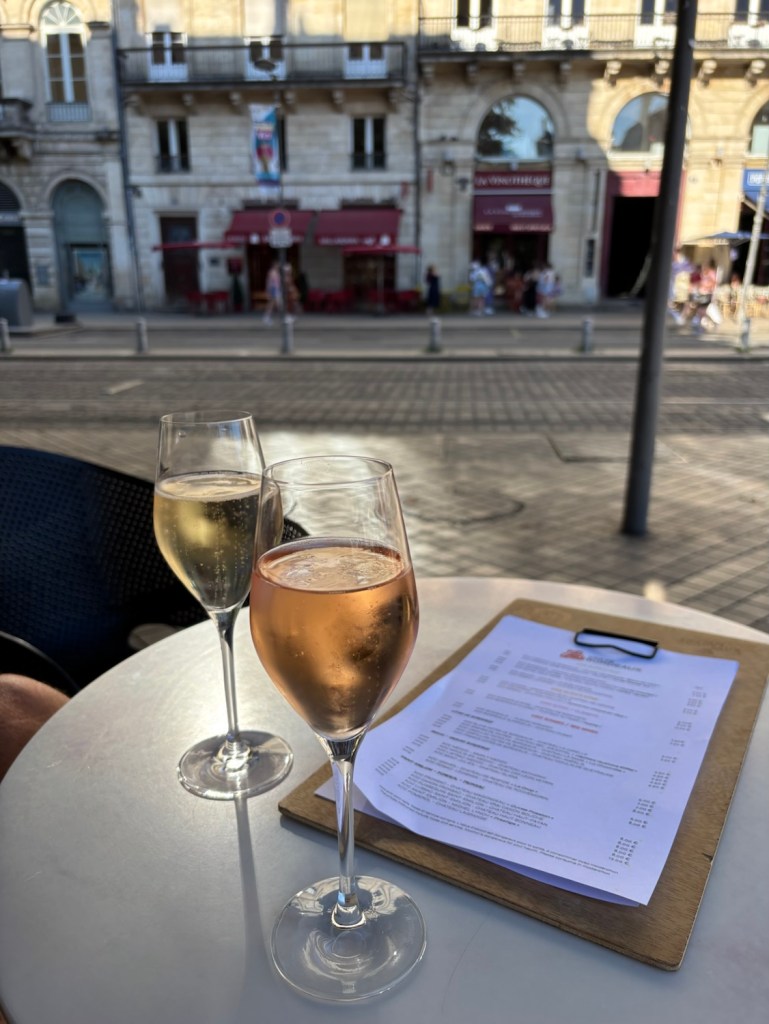 Returning to the city later in the day we did just that at a place that trains sommeliers. A wine list in hand, we choose a glass of bubbles and still white to start with while watching Bordeaux pass us by in the early evening sunshine.
