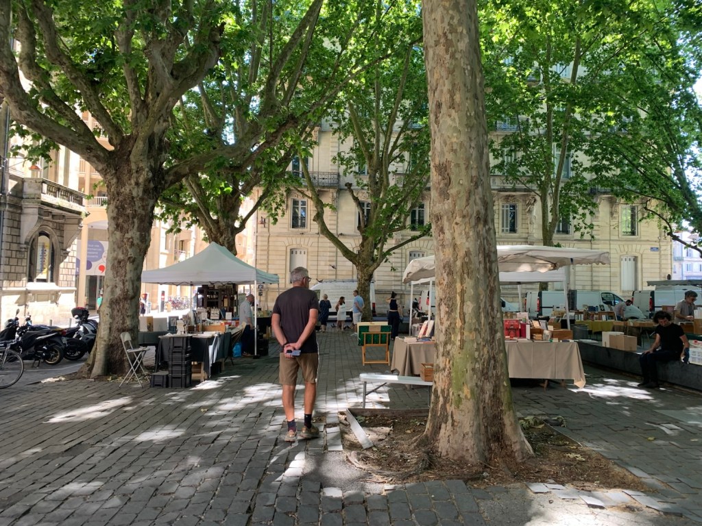 Making our way by tram into the city, we walked to the Place Pey-Berland for the start stopping at the open air book market for a browse.
