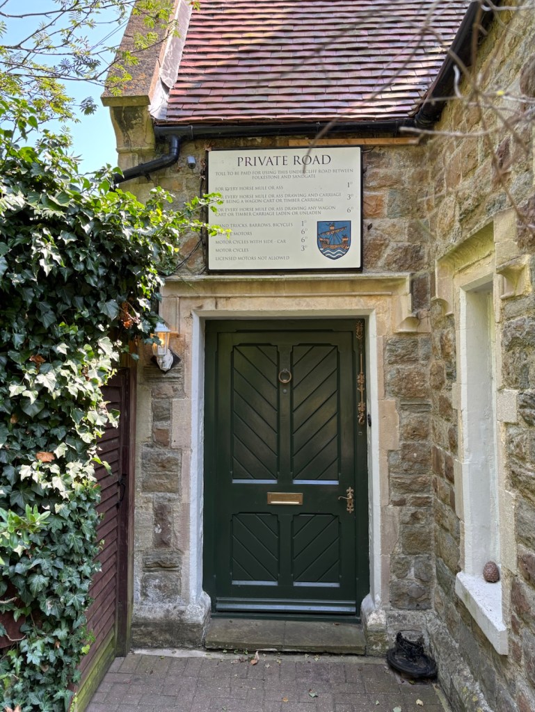 Leaving town we passed the Toll House on the edge of the Lower Leas Coastal Park. Originally timber built in 1820, and later replaced with stone, it was used to collect tolls for using the road between Folkestone and Sandgate. A mule, horse or ass – 1d, and the same drawing a carriage with timber – 6d.