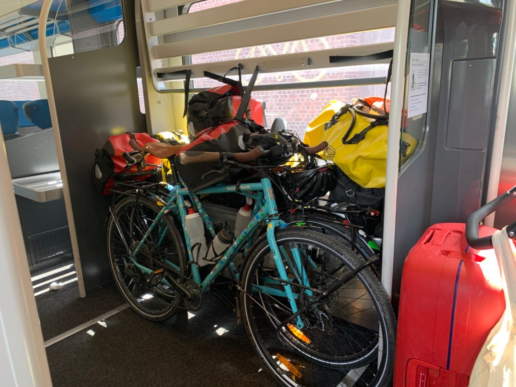 To our rescue were the lovely crew on board the train. They located the suitcase owner and got them moved to the nearby luggage racks. Bikes now nicely in place with all our panniers carefully positioned in and around.