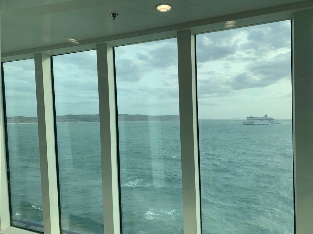 Having a quick bit to eat and writing some postcards, we got them posted, and headed off to the ferry terminal. It didn’t seem far away but it took quite a while to ride the labyrinth of roads to the loading queue. We were considered a car and followed the car signs through 3 checkpoints, including UK immigration, and lined up waiting for the ferry in the blustery conditions.